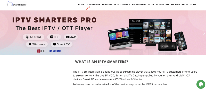 Ouvrez votre navigateur et recherchez IPTV Smarters Pro ou allez directement sur le site officiel : ? https://www.iptvsmarters.com ➡️ (Photo1 : Capture d’écran du site officiel IPTV Smarters)